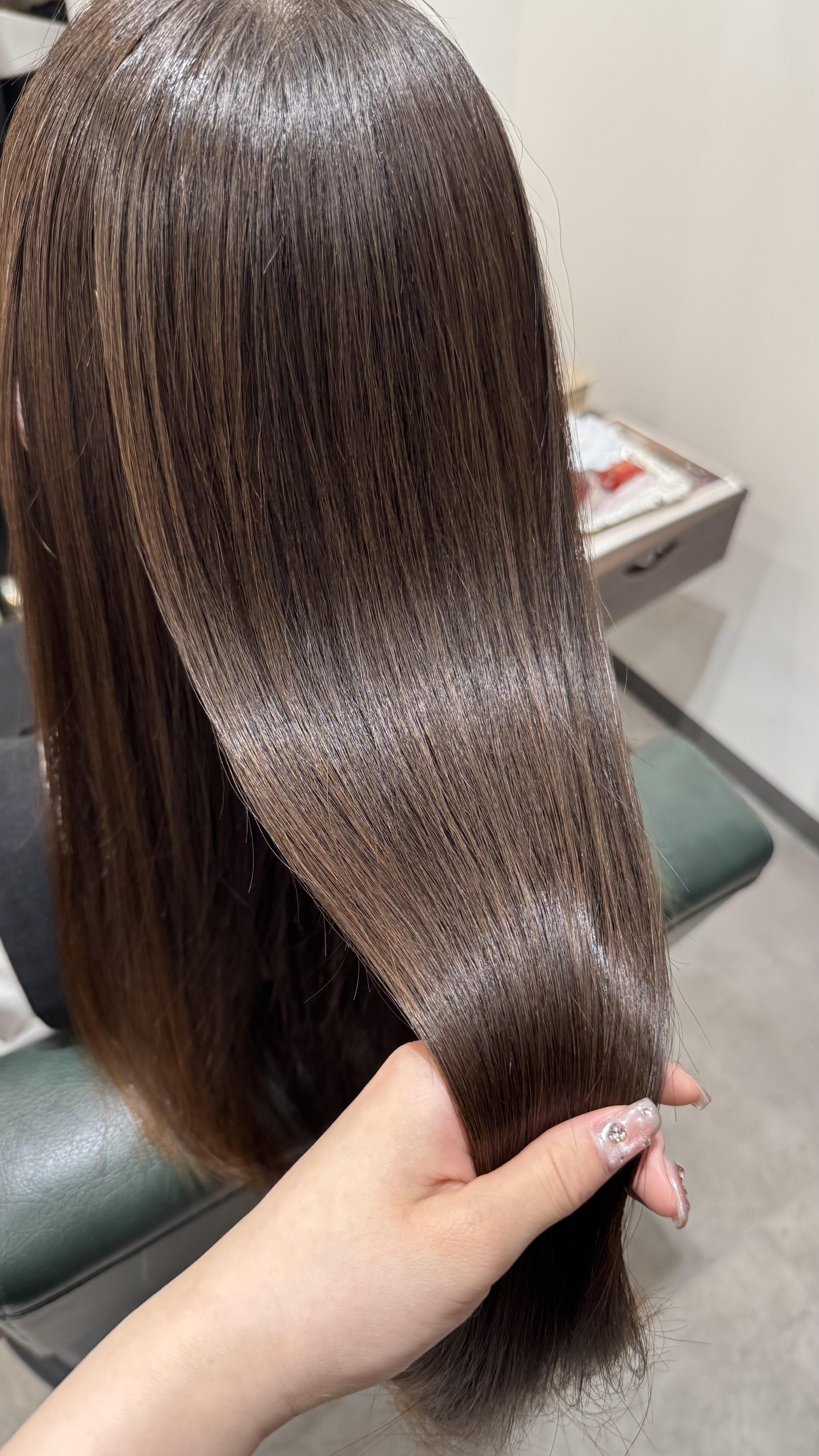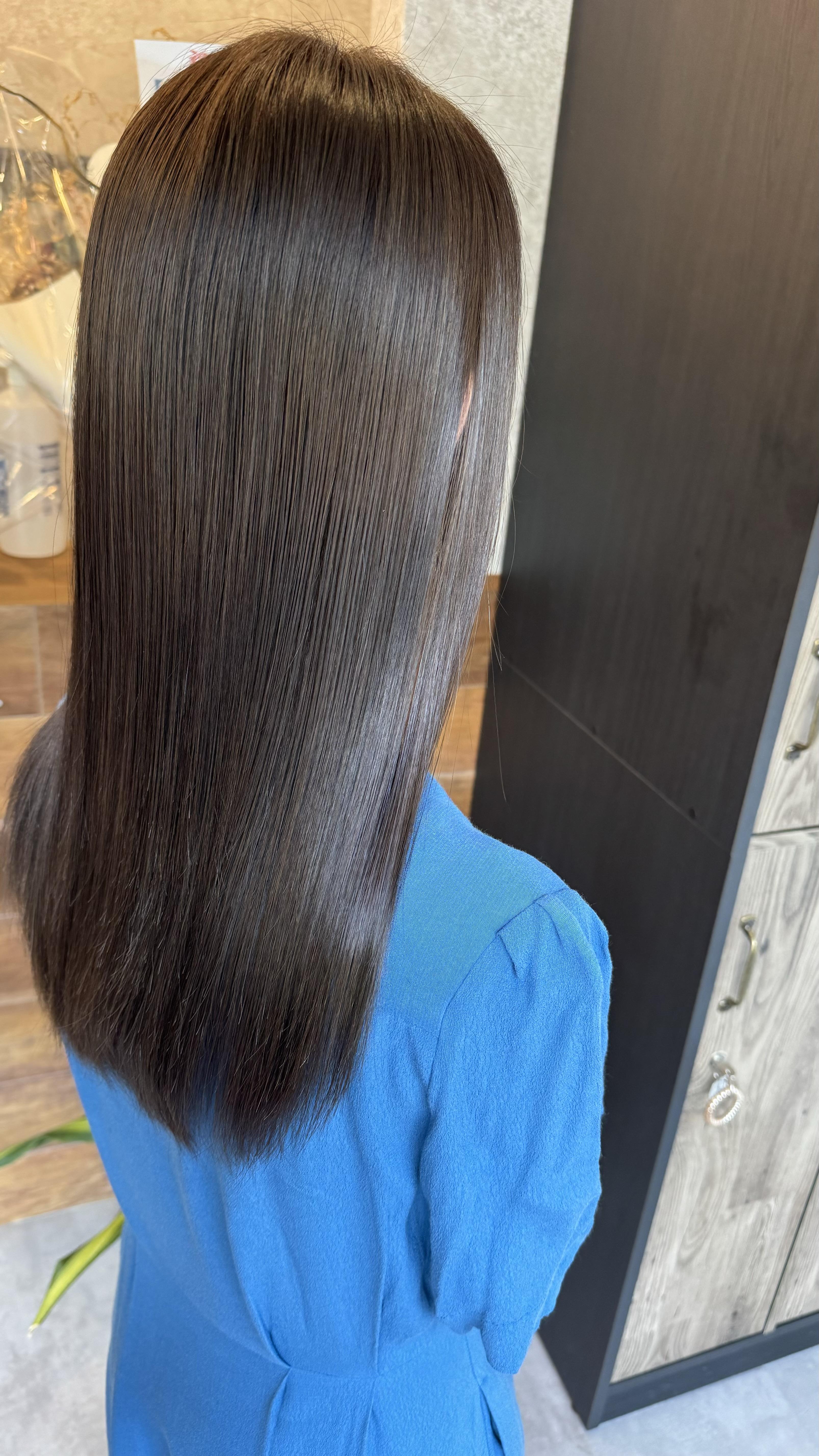 酸性ストレートと髪質改善トリートメントを組み合わせたダメージレスストレートパーマです。極上の質感をご体験ください!! ロング料金+¥1000 別途シャンプーブロー¥2000
